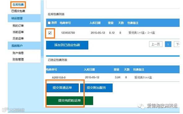 3.电商包裹到达爱德淘仓库入库后,您可在“在库包裹”中选中包裹提交订单。
