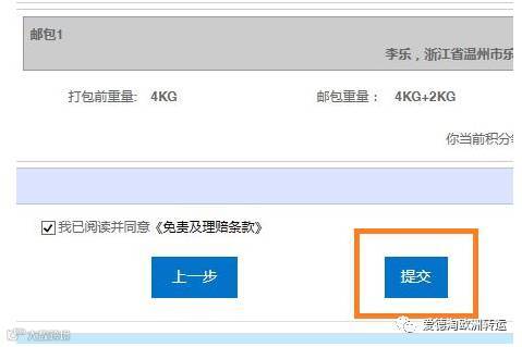 5.提交订单(爱德淘系统计费规则是按入库重量+2公斤(预收打包可能增加的重量),最终计费按照实际出库重量,多退少补):