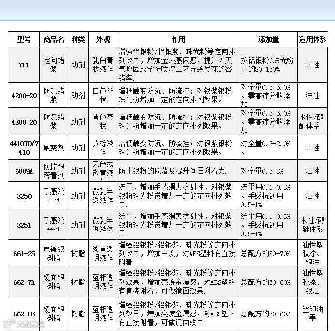 如何选择适合的银粉银浆珠光漆助剂?带以上问题下面小编给您推荐大概适用的产品,参考下图