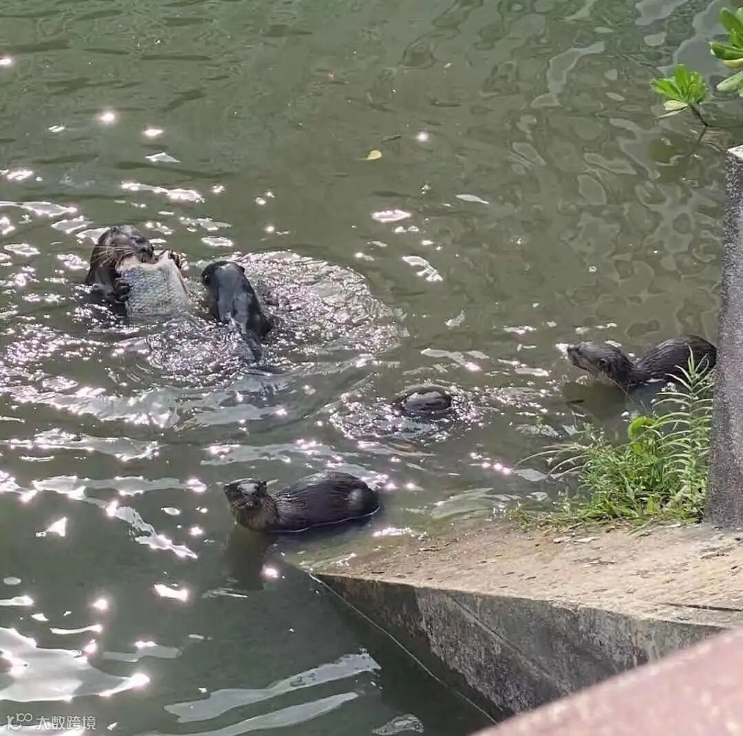 大口吃鱼的水獭家族。