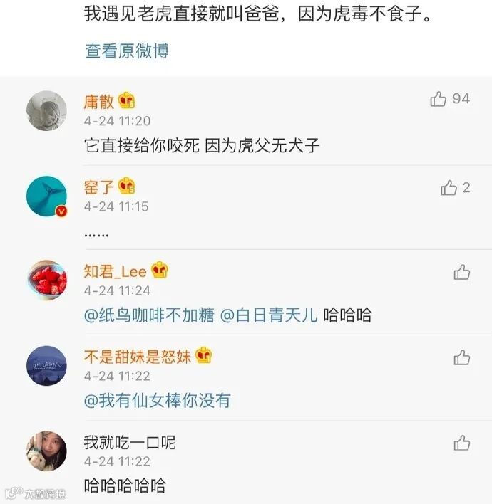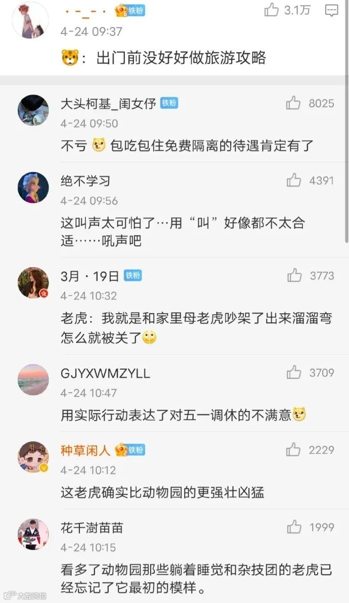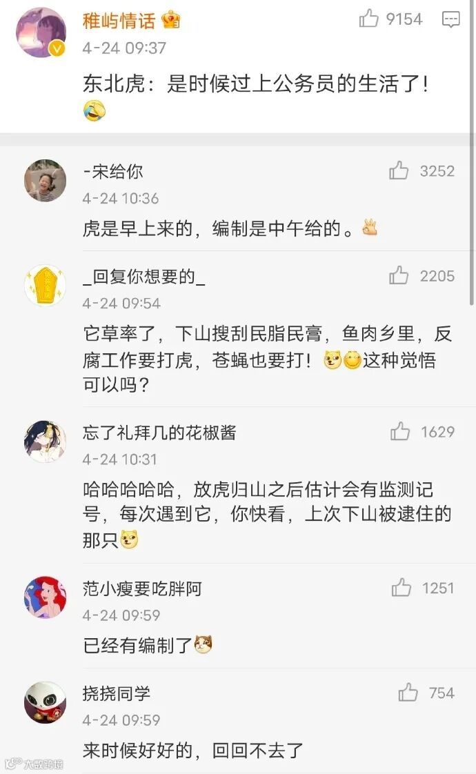 当时事态一出,就有直播平台直接现场播出了实时画面,引起了广泛关注。而这只东北虎在黑龙江密山白鱼湾镇临湖村逗留的十多个小时期间,也炸出了网上一堆杀沙雕网友。各种评论脑洞大开,小编表示有被笑到哈哈哈。