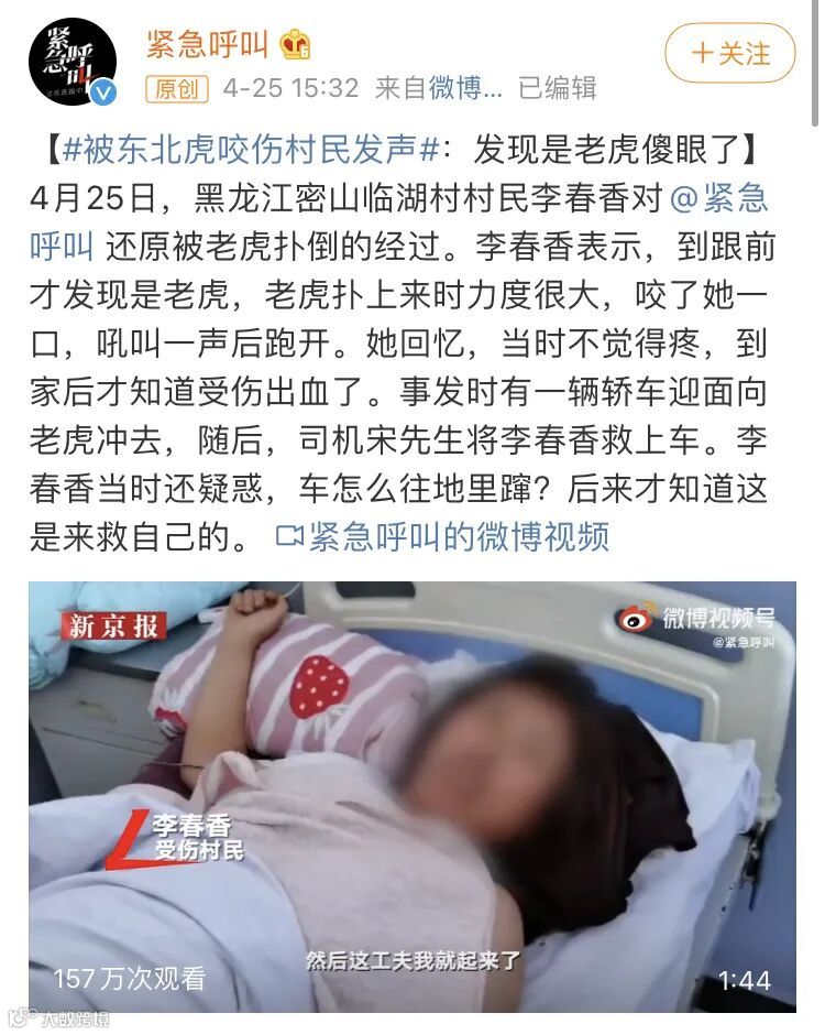 据了解,被东北虎扑伤的村民右肩有五处大小不等的伤口,部分肌肉有损伤,但没有重要血管、神经、脏器和骨骼的损伤。目前,伤情稳定,正在恢复治疗,已无大碍。可能老虎也真的不饿,就是玩儿,害,算是不幸中的万幸,毕竟谁能想到出个门还能被老虎扑倒呢?今日,受伤村民也发出了声明,向大家报了平安。