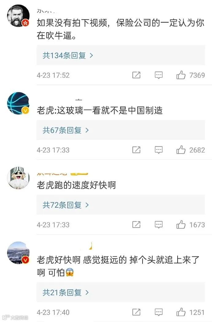 而后工作人员开车追踪老虎时,也遭遇老虎的飞奔袭击。所幸,工作人员迅速驾车逃离,但车窗已被老虎一掌拍碎。