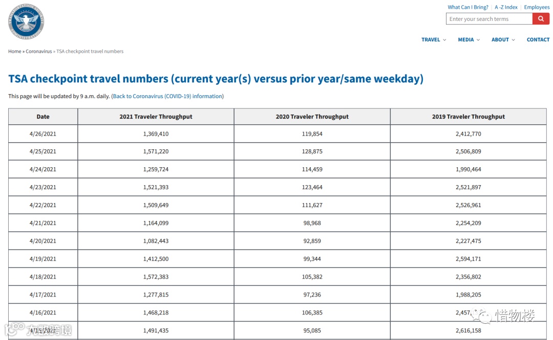 四月底美国的飞机旅客人数,2019年平均每天220万,2020年平均每天11万,2021年平均每天130万。目前的量约为19年的59%