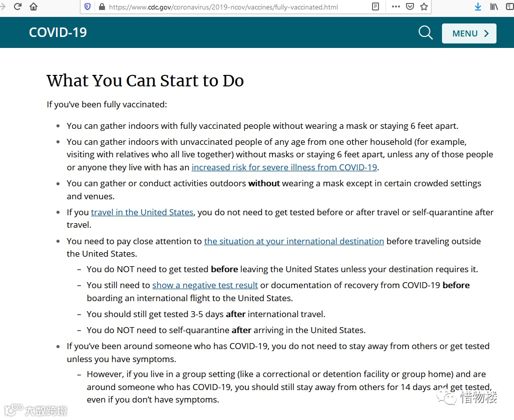 美CDC新指导,完成疫苗接种之后,除了特殊情况之外,户外不用带口罩;接触了新冠病人不用隔离不用检测;室内跟都接种过的人一起,不用带口罩,不用保持安全距离。
