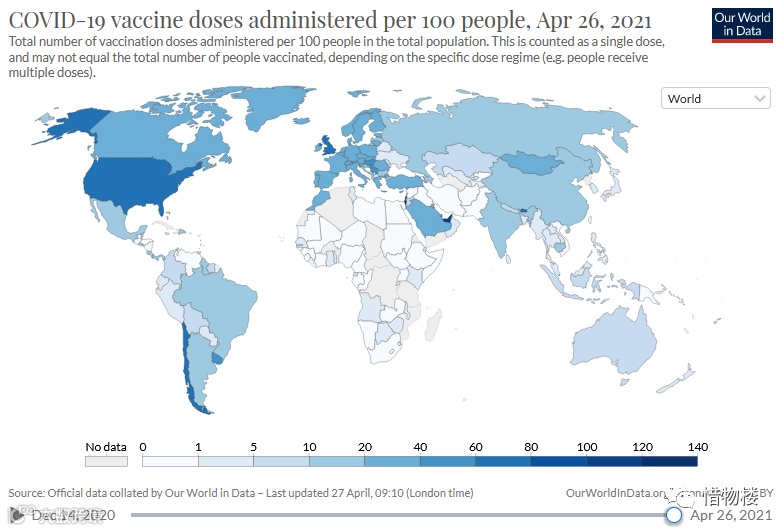 WorldInData 20210428 数据,全世界已经接种超过10亿剂。当前的疫苗接种比例,欧美大部分国家的接种比例处于20%-40%,部分国家超过60%