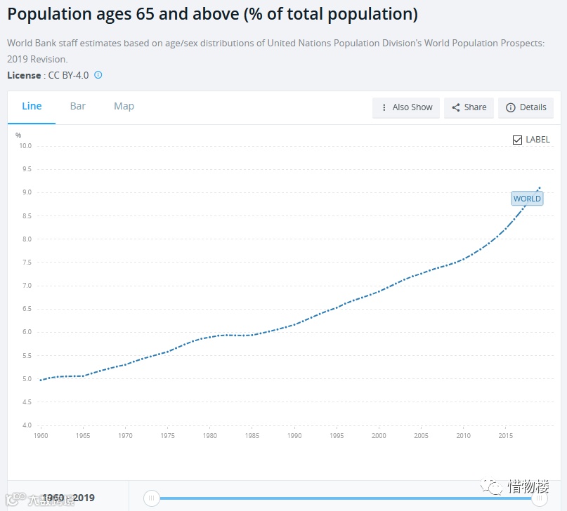 世界银行数据,65岁以上老年人占总人口的比例,过去50年,稳步上升。2019年的比例约为9.2%