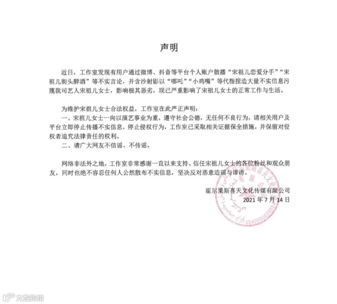 而宋祖儿工作室今天也发出了声明。