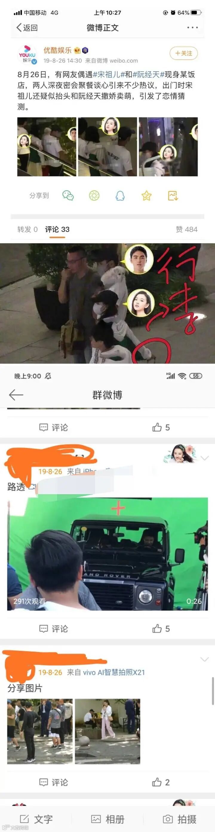 2019年8月26日,媒体报道两人深夜聚会并上热搜,实为剧组转场杭州拍摄,身边有工作人员和随身携带行李,当天有不少剧组拍摄路透。