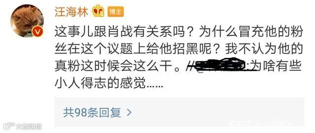 面对网友质疑其“是否是幸灾乐祸”时,汪海林在评论区不忘继续“拉”着肖战:“这事跟肖战有关系吗?为什么冒充他的粉丝在这个议题上给他招黑呢?我不认为他的真粉这时候会这么干。”
