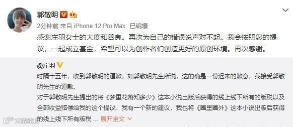 而对于此事,郭敬明也是欣然接受了提议,并诚恳表示道:感谢庄羽女士的大度与善良。还再次向庄羽女士说了对不起。他希望可以为创作者们创造更好的原创环境。