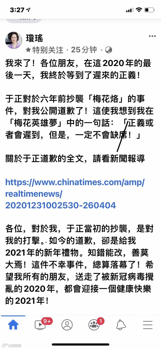 她在文中写道,于正就六年前的《梅花烙》抄袭事件正式道歉,让她想到在“梅花英雄梦”中的一句话,“正义或许会迟到,但是,一定不会缺席”。她还表示,这份致歉是2021年的新年礼物,“知错能改,善莫大焉,这件不幸事件总算落幕了。”