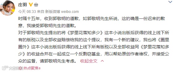 在道歉的同时,我将把《梦里花落知多少》这本小说出版后获得的线上线下所有的版税以及全部收益汇总计算清楚之后,全部赔偿给庄羽女士。如果庄羽女士不愿意接受,我会把这笔钱捐给公益慈善机构,接受公众的监督。