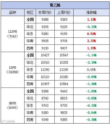 价格:LLDPE(7042)市场均价为9388元/吨,较上周均价上涨105元/吨,涨幅为1.13%;LDPE(2426H)市场均价为10427元/吨,较上周均价下跌120元/吨,跌幅为1.14%;HDPE(6095)市场均价为9268元/吨,较上周均价下跌175元/吨,跌幅为1.85%。