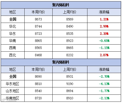 粉料全国均价为8673元/吨,较上周均价上涨104元/吨,涨幅为1.21%。粒料全国均价为8690元/吨,较上周均价下跌241元/吨,跌幅为2.70%。
