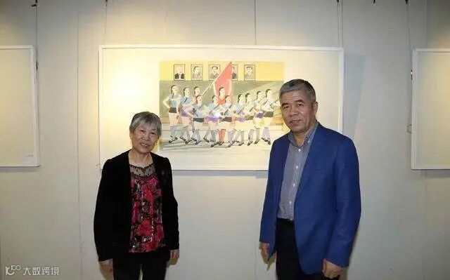 博宝艺术网艺术总监杨维民教授与邵炳凤女士合影,两人身后为邵女士作品《芳华》