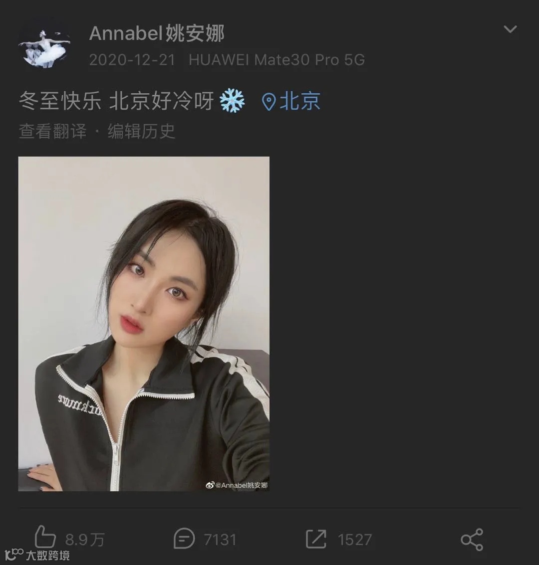 她在去年12月开通了新浪微博,一条简单的“冬至快乐,北京好冷呀”的自拍照,嗖嗖嗖就冲上了微博热搜,引发众多网友围观。