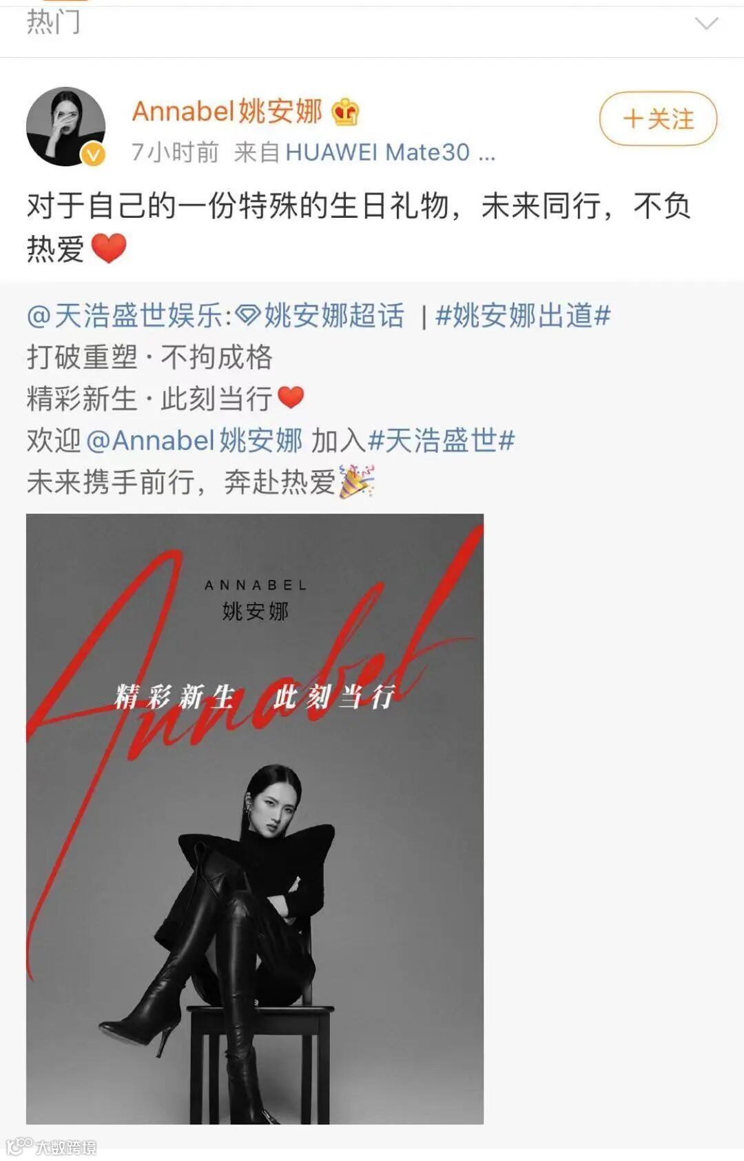 今日,天浩盛世娱乐官博发文宣布,姚安娜加入天浩盛世。同时晒出官方海报。