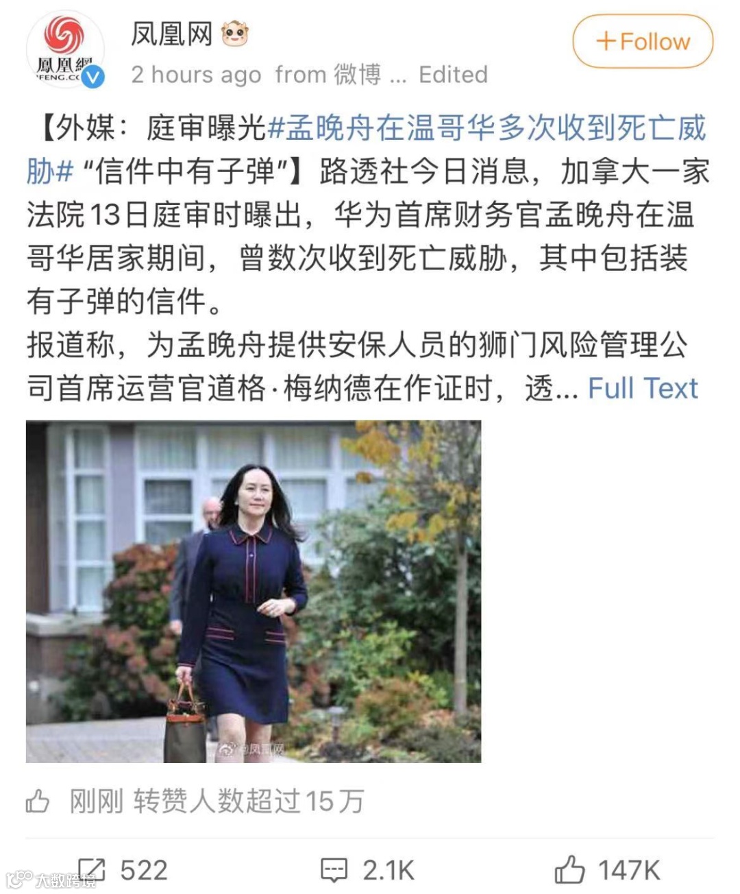 华为首席财务官孟晚舟在温哥华居家期间,曾数次收到死亡威胁,其中包括装有子弹的信件。