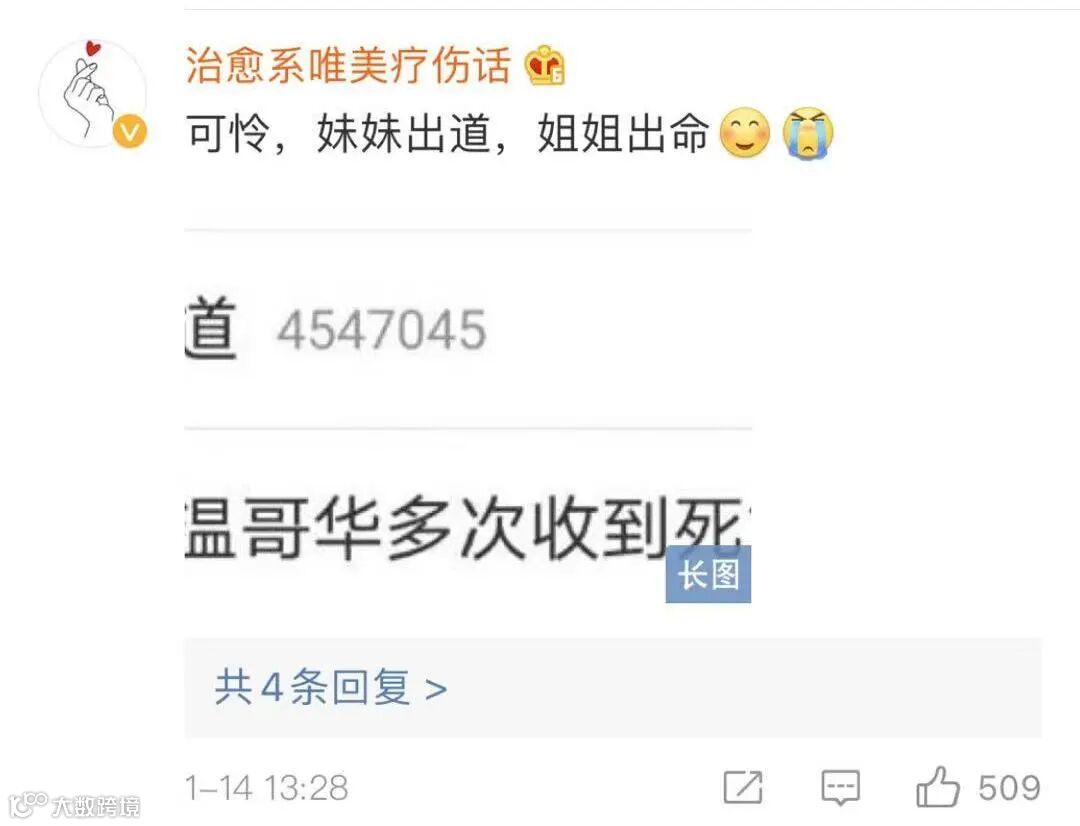 在她出道的微博下评论:“妹妹出道,姐姐出命。”