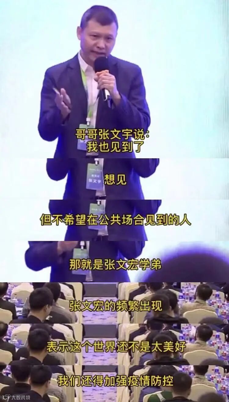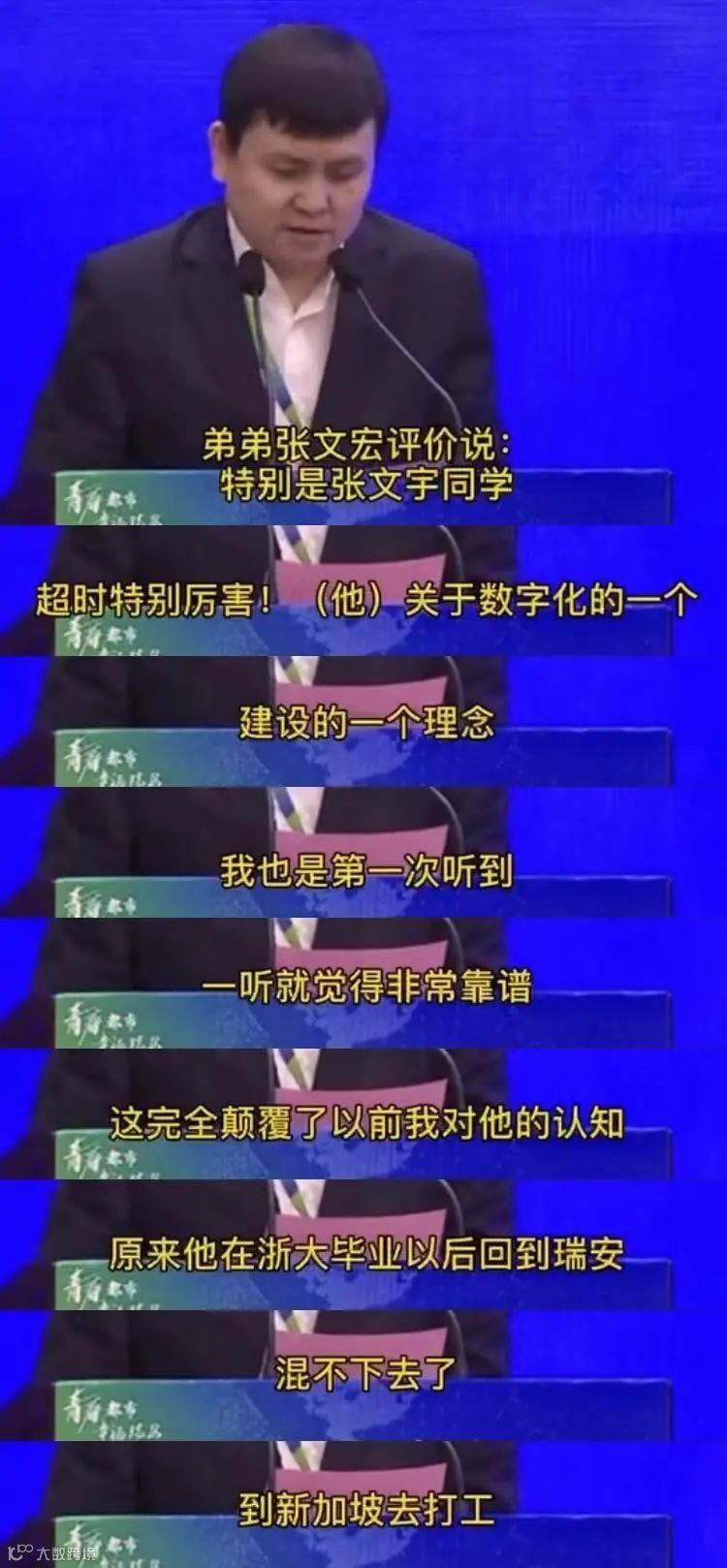 而后是弟弟发言,不仅称呼哥哥为“张文宇同学”,还一开口就吐槽哥哥张文宇超时特别厉害:都是业界的领袖级的人物,居然演讲都要超时,今天超了这么多,为什么?对这个城市这个家乡怀着太深的感情了。生怕下次校友会不叫他们讲,特别是张文宇同学,超时特别厉害,刚才关于数字化的建设的理念,我也是第一次听到,一听就觉得非常靠谱,这完全颠覆了以前我对他的认知。
