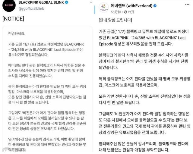BLACKPINK方发声明回应接触熊猫幼崽事件,称接触是在专业兽医和饲养员的参与下,遵守严格的防疫管理及卫生守则进行的,特别是BLACKPINK在见到宝宝熊猫时,成员都穿着卫生手套、口罩和防护服,表示:“每场场景切换时,都进行了手、鞋消毒的处理。”
