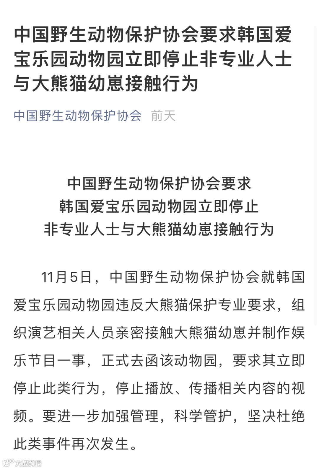 11月5日,中国野生动物保护协会通过公众号表示,就韩国爱宝乐园动物园违反大熊猫保护专业要求,组织演艺相关人员亲密接触大熊猫幼崽并制作娱乐节目一事,已正式去函该动物园,要求其立即停止此类行为,停止播放、传播相关内容的视频。要进一步加强管理,科学管护,坚决杜绝此类事件再次发生。