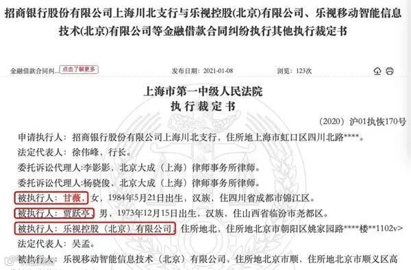 1月8日,乐视控股(北京)有限公司、乐视移动智能信息技术(北京)有限公司等新增一份执行裁定书,即《招商银行股份有限公司上海川北支行与乐视控股(北京)有限公司、乐视移动智能信息技术(北京)有限公司等金融借款合同纠纷执行其他执行裁定书》,案号为(2020)沪01执恢170号。申请执行人为招商银行股份有限公司上海川北支行。