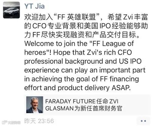 在得知此消息之后,贾跃亭在社交平台上激动发声:欢迎加入“FF 英雄联盟”,希望Zvi丰富的CFO专业背景和美国IPO经验能够助力FF尽快实现融资和产品交付目标。