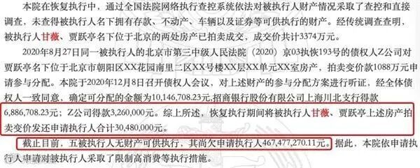 6个月前,甘薇还曾因不履行法律文书确定的义务,被上海市第一中级人民法院限制出境。当时申请执行人就是招商银行上海川北支行,执行标的金额高达5.33亿元。