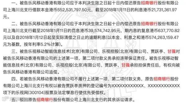 2017年6月,乐风公司未能按照约定补足保证金,也并未按约支付当期利息,招商银行将4位担保人告上法庭。2019年6月,法院发布一审结果,判定乐风公司10日内偿还招行上海川北支行本金、利息及罚息等,贾跃亭、甘薇等人承担连带担保责任。