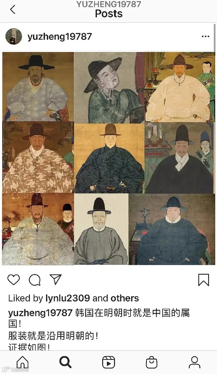 随后他在ins上晒出了一张明朝时期的服饰图,并回应道,“韩国在明朝时就是中国的附属国,服装就是沿用明朝的,证据如图”。