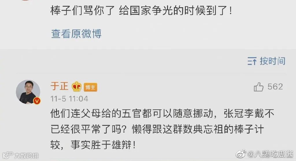5日,于正发文回怼:“他们连父母给的五官都可以随意挪动,张冠李戴不已经很平常了吗?”
