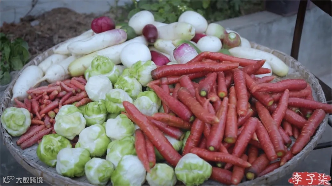 在李子柒这段近20分钟的视频里,是各种蔬菜的播种发芽和采摘,然后是清洗切配和腌渍,最后再是泡菜的各种入菜的吃法。