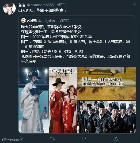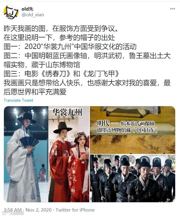 事情的起因是一位中国的知名漫画家old先在社交平台上传了一组插画,图中的人物是她笔下人气漫画《19天》的角色,皆身穿着带有汉服元素的新式服装,整体的装饰也是十分符合人物特色,old先在发布的时候也只是简单配文:“古风混搭。”