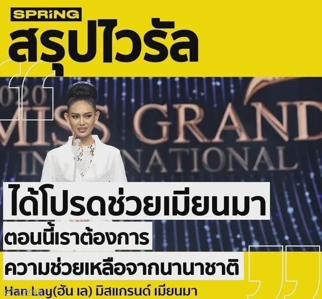 就在缅甸军政府安全部队在全国范围内对手无寸铁的平民使用致命暴力镇压,造成缅甸40多个城镇中已知114人死亡的惨剧当日,国际小姐(Miss Grand International)选美比赛在泰国曼谷举办总决赛,参赛的缅甸佳丽韩蕾(Han Lay)发言,感谢主办单位给予平台,并声泪俱下地向国际社会求助。