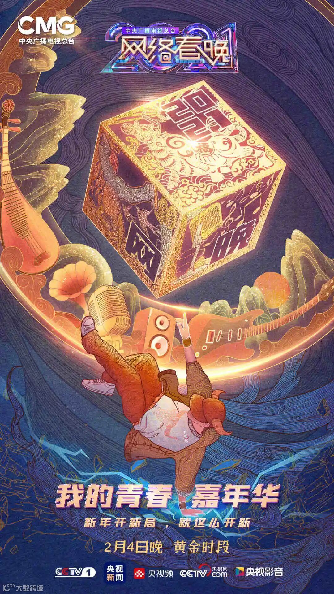 今天(1月28日),2021网络春晚正式发布主题概念海报,传统工笔画技法+现代街舞青年+鎏金魔盒的奇幻组合,将网晚的青春气息、网络风格极致表达出来。