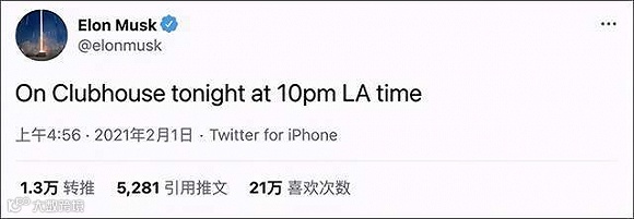 接着他又更新了一条,“今晚在Clubhouse,10点见。”火速转战了另一款美国语音社交App Clubhouse。