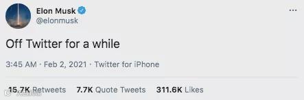 2月2日,推特大户马斯克,在推特上发了一条推文,“off Twitter for a while” (离开推特一阵子),美国网友迅速吃瓜,纷纷好奇“钢铁侠”这是打算去哪里。