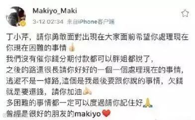 在直播的过程中,Makiyo还收到了来自丁小芹的威胁短信,只要她不公开谈论这件事,隔天就汇款给Makiyo,还要求分期付款。