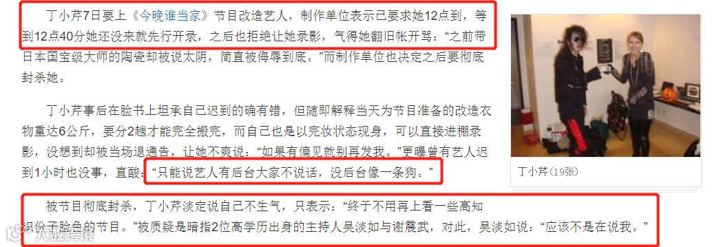 除了被节目封杀,丁小芹还被曝经常性迟到,有一次在剧组迟到四天……