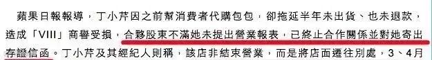 据说合伙股东对她不提营业报表同时造成品牌商业信誉受损的事情非常不满,跟她终止合作关系。