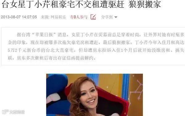 2013年,丁小芹入住月租高达5万2千元新台币的台北大直豪宅,但却遭房东控诉入住1个月后就开始没缴房租、搞失联,房东多次催租后寄出存证信函提前解约。最后丁小芹推着名牌行李箱,在丁父的帮忙之下狼狈搬离豪宅。