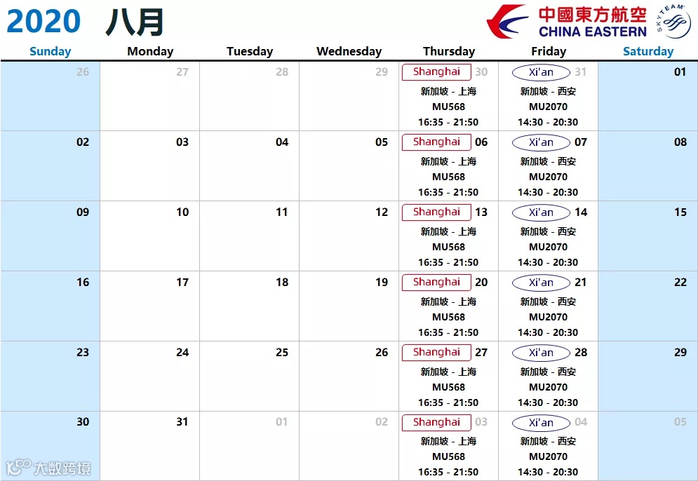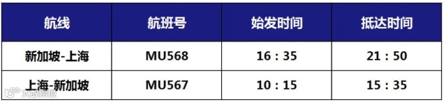2020年8月1日-8月31日新加坡-上海往返航班调整为每周四执飞,航班号MU568。