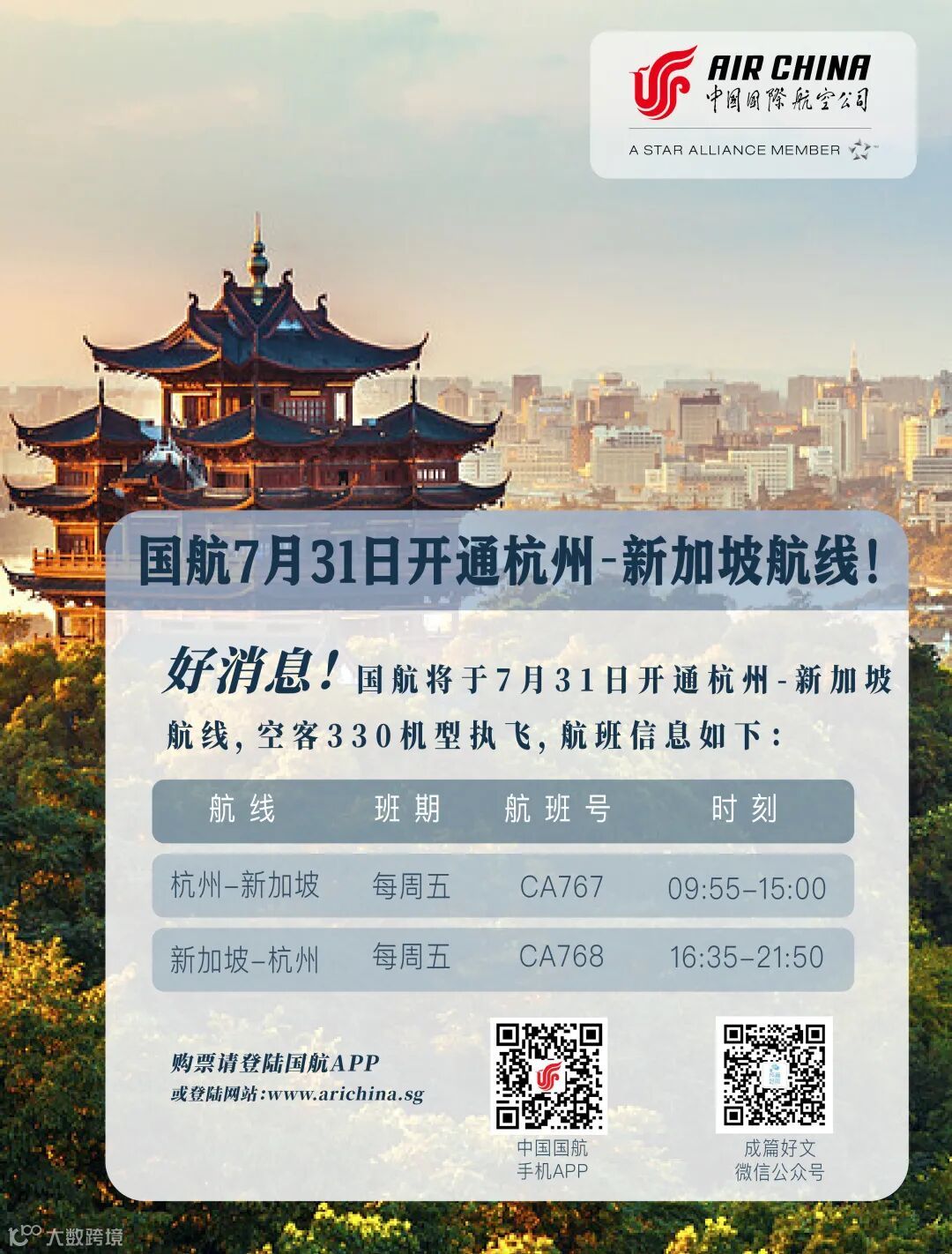 2020年7月31日起国航开通杭州-新加坡航线。