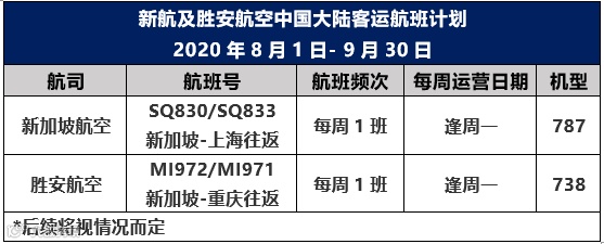 敬请留意,8月1日-9月30日期间,除以上航班外,新航及胜安航空其余中国大陆-新加坡航班的客运服务已取消,后续航班新航及胜安航空将根据疫情防控情况做动态调整。