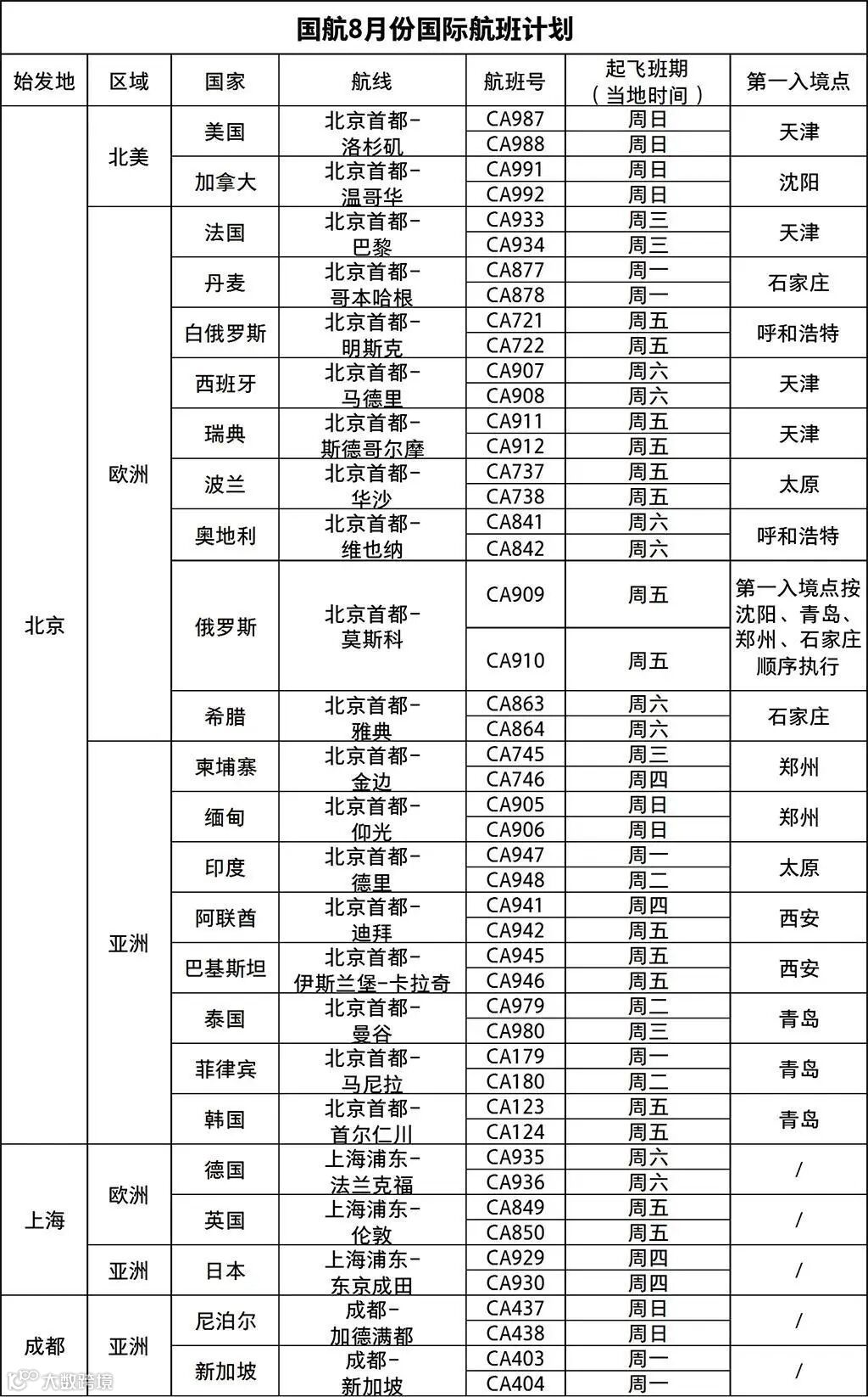 自2020年8月1日0时至8月31日24时,国航每周可执行国际航线共计24条,其中涉及北京分流航线19条,上海国际航线3条,成都国际航线2条,具体航班计划及关于北京地区的第一入境点计划如下: