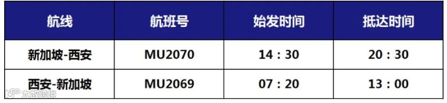 2020年7月31日起东航恢复新加坡-西安往返航班为每周五执飞,航班号MU2070。