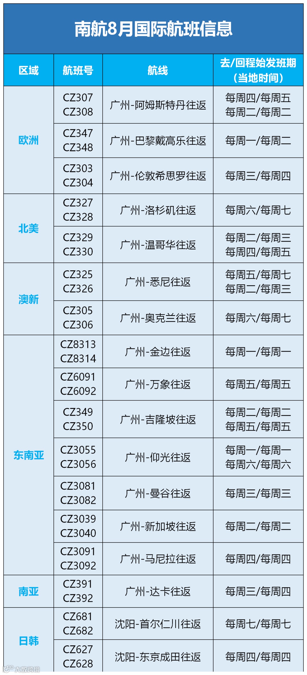 8月,南航每周可执行国际航线共计17条,具体航班计划如下: