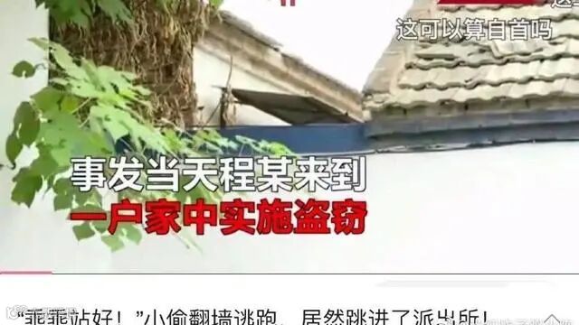 正在实施盗窃的小偷被警察叔叔逮个正着,开口喊道:乖乖站好!只见小偷翻墙准备逃跑,不料想居然跳进了派出所!